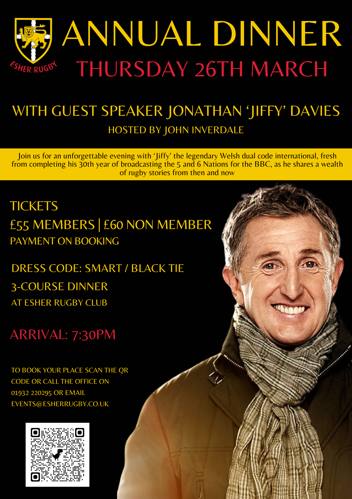 Join us for an unforgettable evening with ‘Jiffy’ the legendary Welsh dual code international, fresh from completing his 30th year of broadcasting the 5 and 6 Nations for the BBC, as he shares a wealth of rugby stories from then and now.