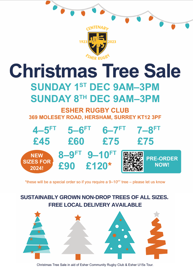 The Under 15s Christmas Tree Sale will take place at Esher Rugby Club on Sunday 1st December and Sunday 8th December between 9am and 3pm on both days.