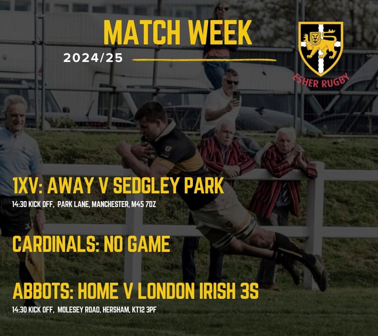 Esher 1st XV are kicking off our return to Nat 1 with a trip to Sedgley Park this Saturday, Kick Off 2:30pm