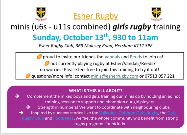 Any questions or for more information please contact minis@esherrugby.com or 07513057221