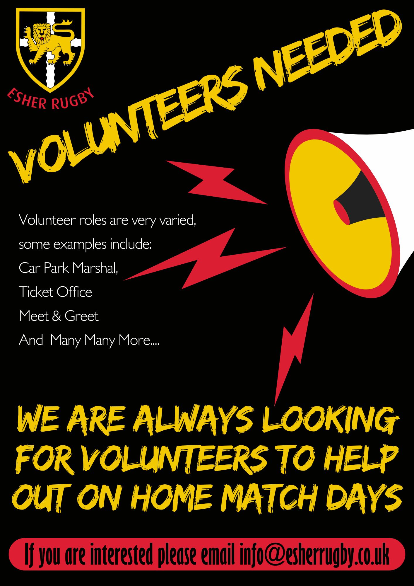 Esher Rugby are always looking for volunteers to help out on our home games.